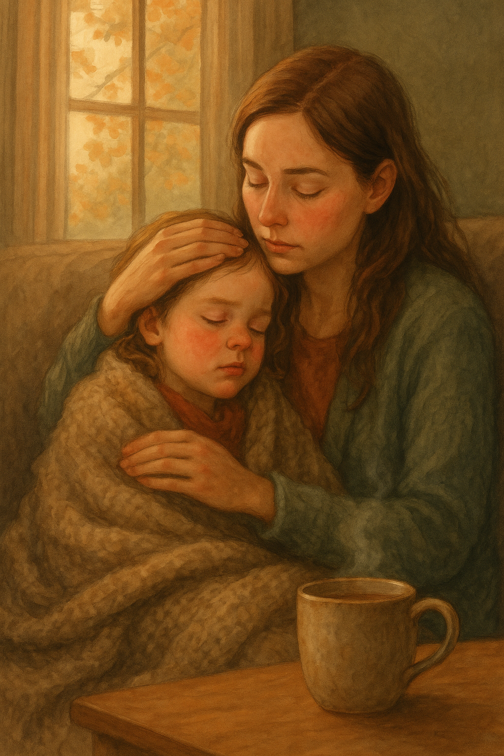 Det er, som om min krop instinktivt ved, hvad der skal ske. Man registrerer varmen mod sin egen kind, den matte stemme, de trætte øjne – og så klikker man over i omsorgstilstand. Der bliver ikke spurgt meget. Man handler bare. Sengen eller sofaen redes om til en rede. Drikkedunken stilles på bordet. Ipaden hentes, og tæppet bliver lagt om igen og igen. Det hele sker i en stille rytme, som kroppen kender, men hjertet alligevel altid mærker. Der er ingen pauseknap for en solomor. Ingen, der tager over, mens man lige går i bad, handler, eller bare trækker vejret i fred. Der er kun én voksen i huset, og hun har ansvaret for alt. Men der er også noget roligt ved det. En slags dyb, gammel kraft, der vågner, når ens barn har brug for én. Man bliver en tryg havn – og alt andet kan vente.